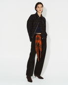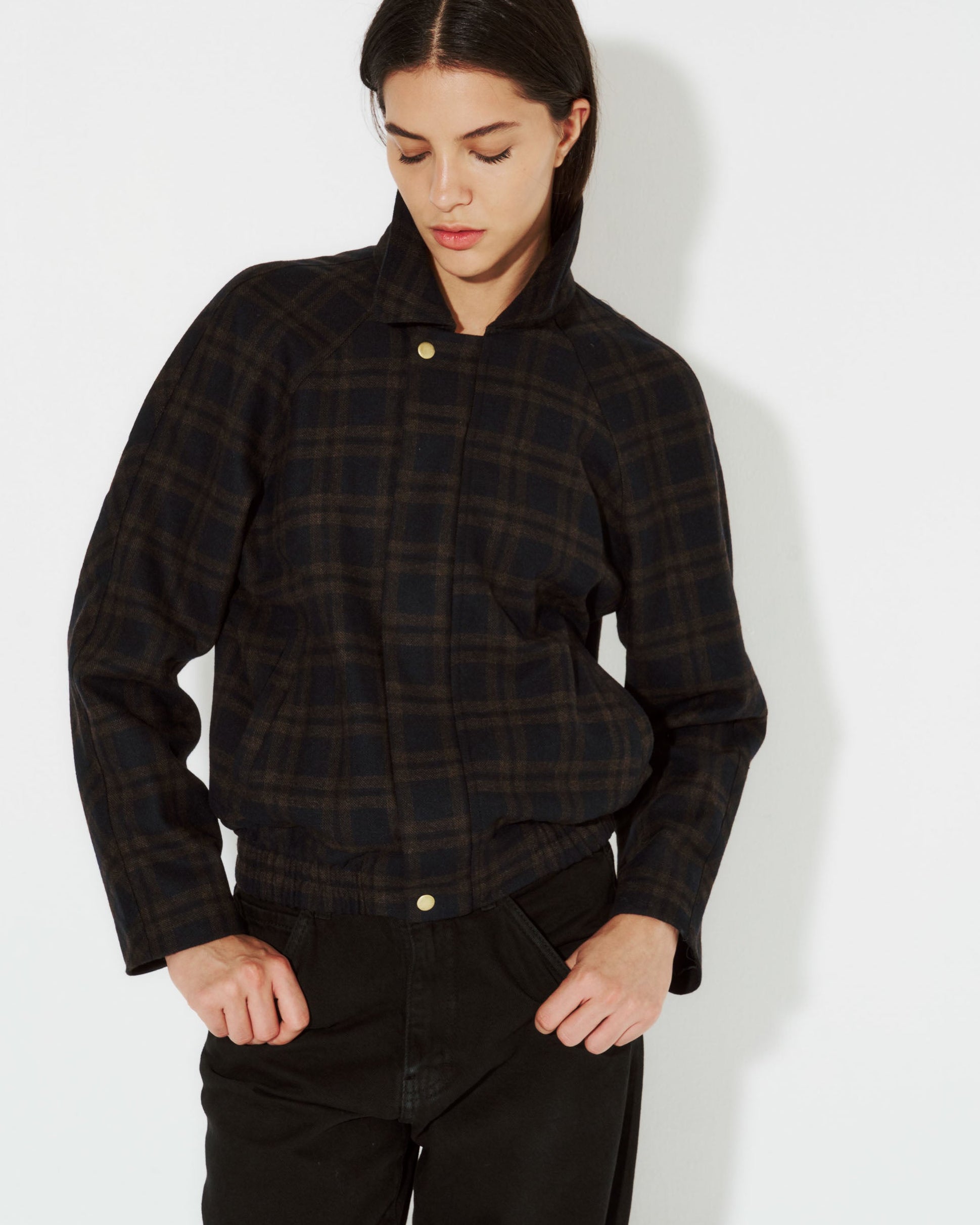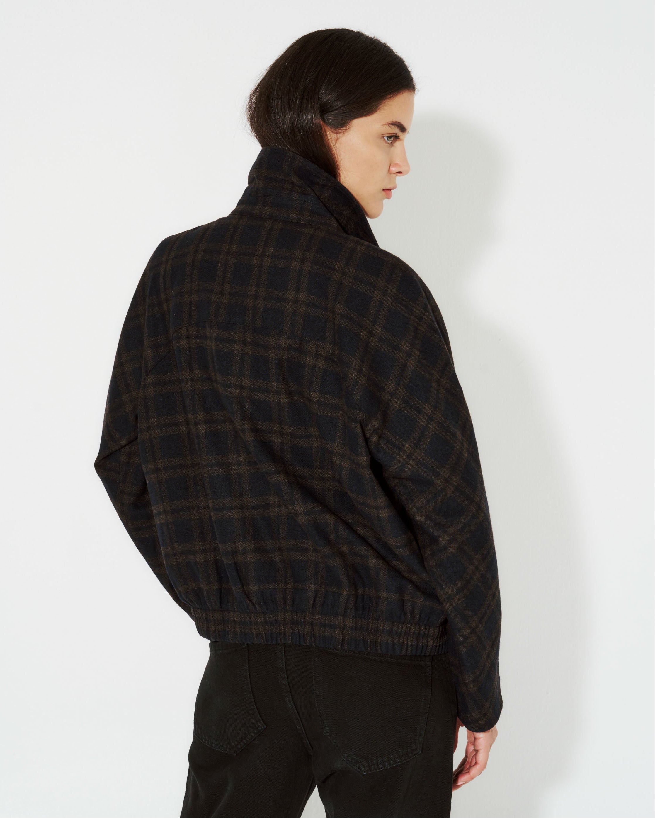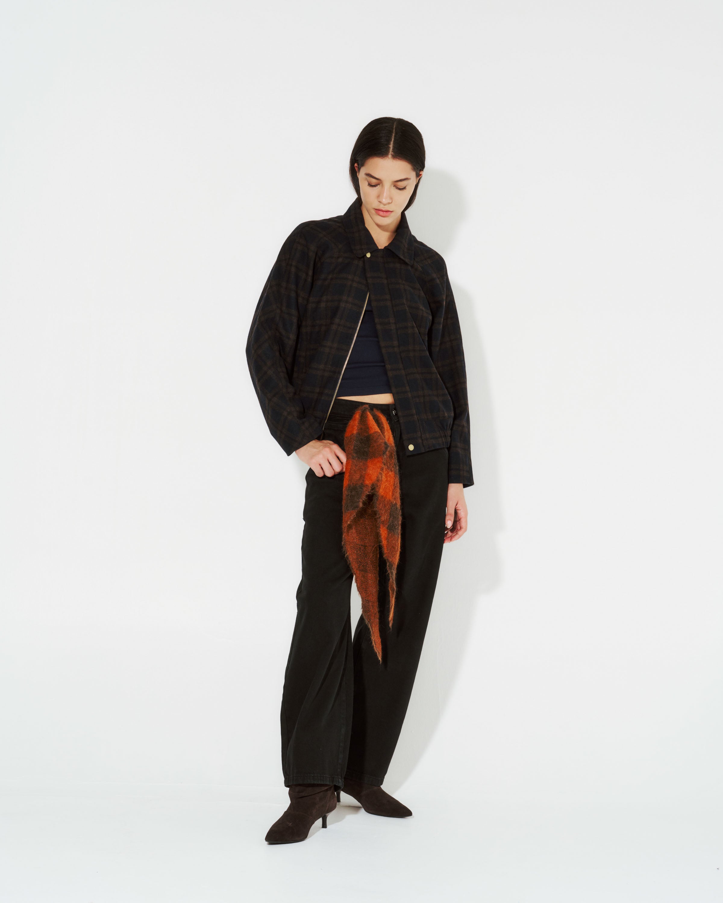 Descubre la elegancia y versatilidad de la chaqueta bomber en paño de lana cuadros naranjo. Su cierre delantero la hace perfecta para cualquier ocasión. Una pieza esencial en tu guardarropa de lujo.