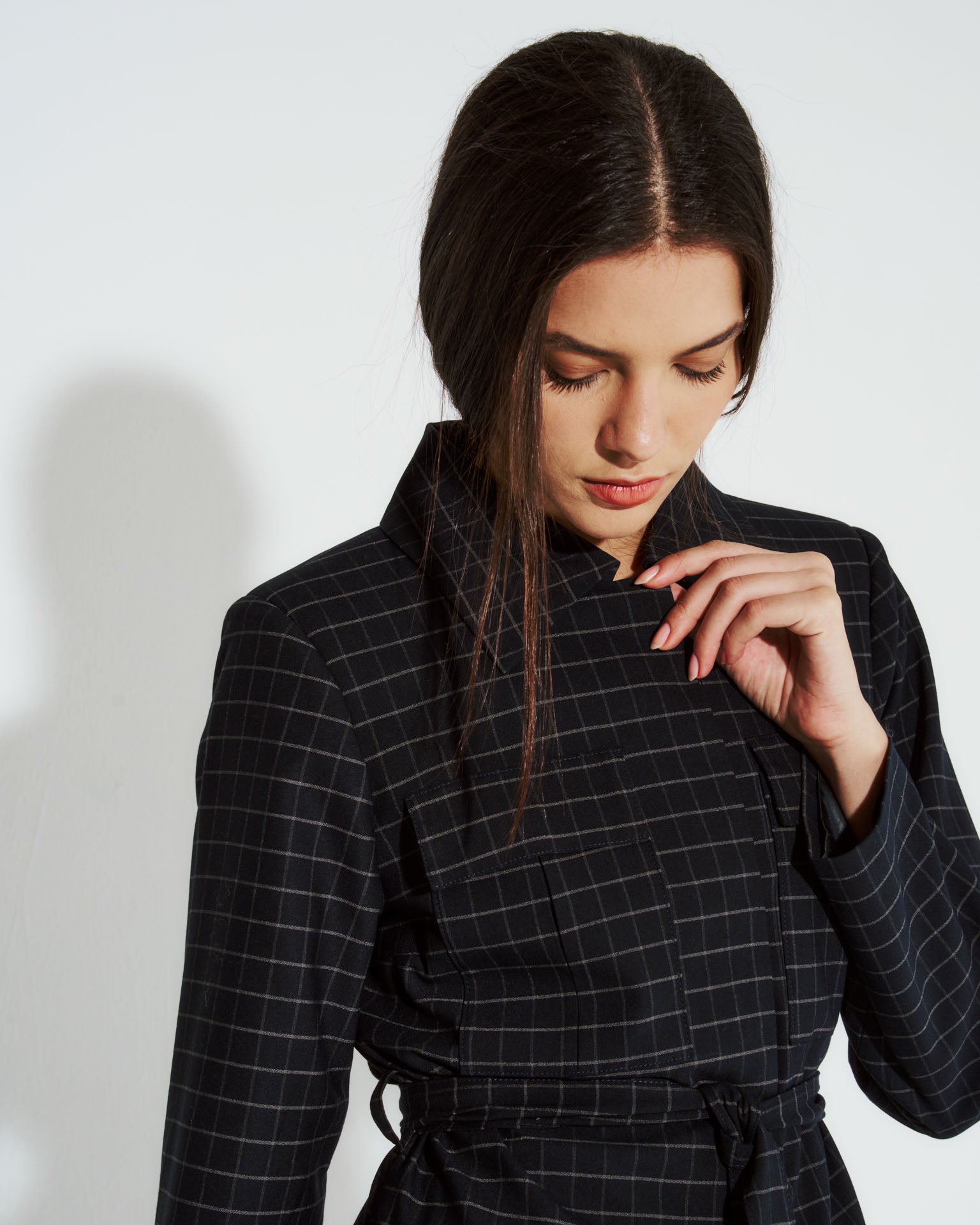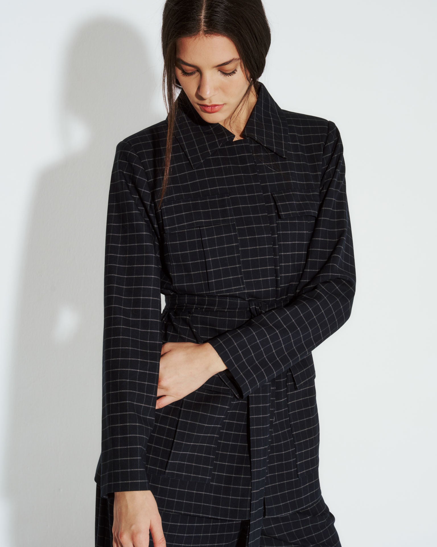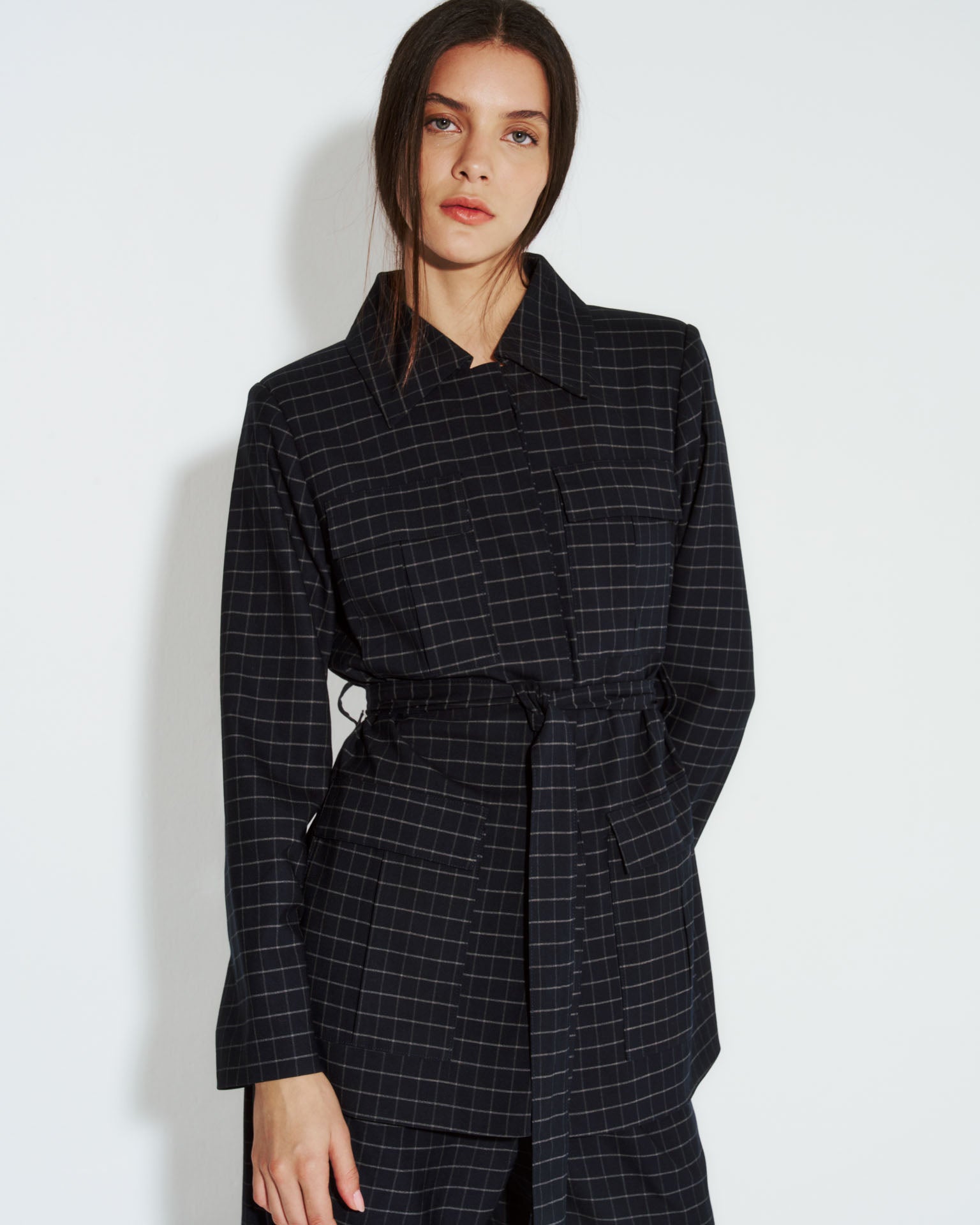 Chaqueta safari Nébula en cuadrille azul, elaborada en lino que ofrece comodidad y transpirabilidad. Cuenta con cintura ajustable mediante lazo para adaptar el largo según tu preferencia, y botones discretos que crean una silueta limpia. Su corte relajado y funcional la convierte en una pieza versátil para combinar con diferentes estilos, desde outfits casuales hasta propuestas más refinadas. Una prenda esencial para tu guardarropa de transición.
