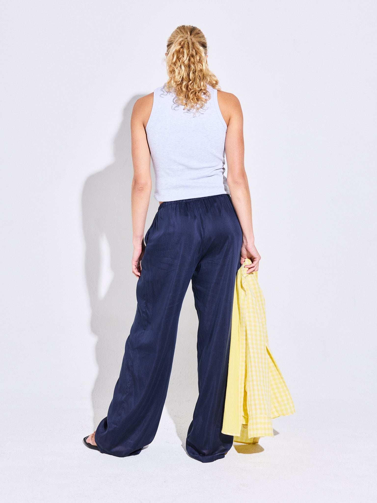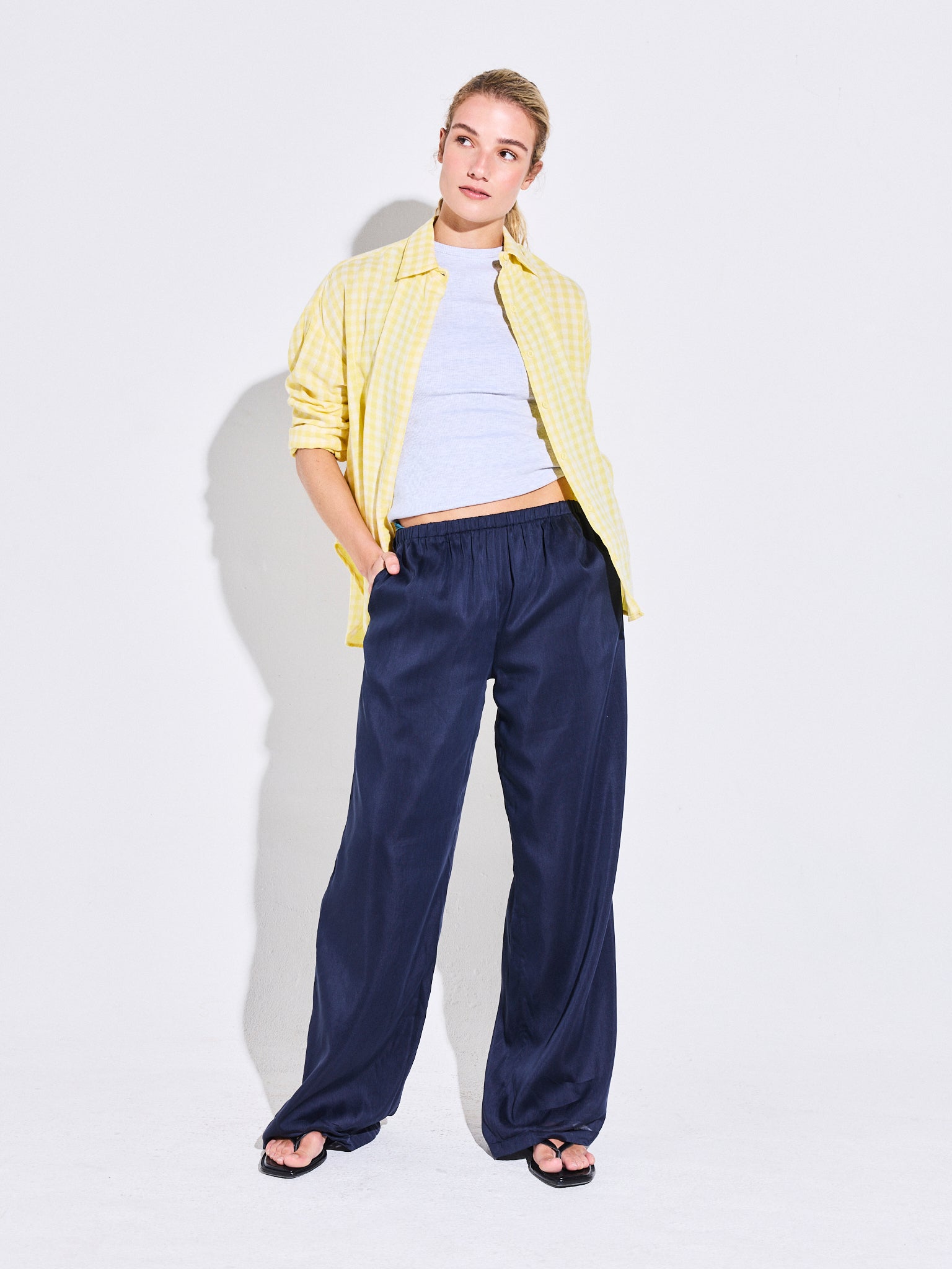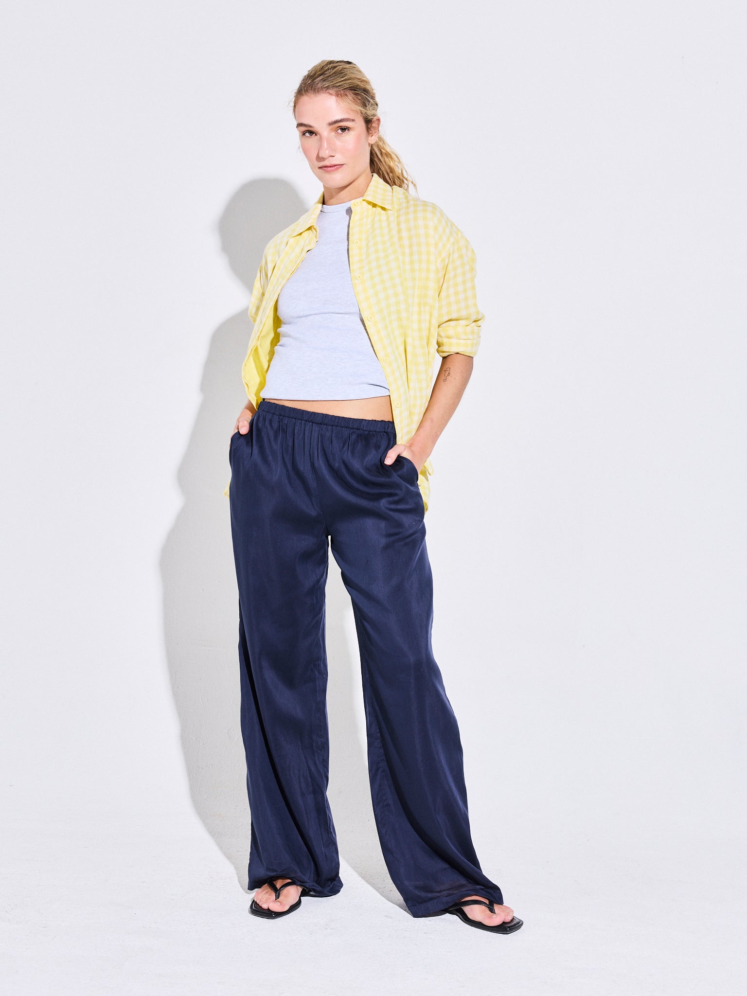 El Pantalón Alegría Azul está confeccionado en cotton silk, una fibra de alta calidad que aporta frescura y suavidad. De calce fluido, cuenta con pretina elasticada y tirante ajustable que permiten un ajuste cómodo y versátil. Su caída recta aporta movimiento y ligereza, convirtiéndolo en un aliado perfecto para los días de verano.