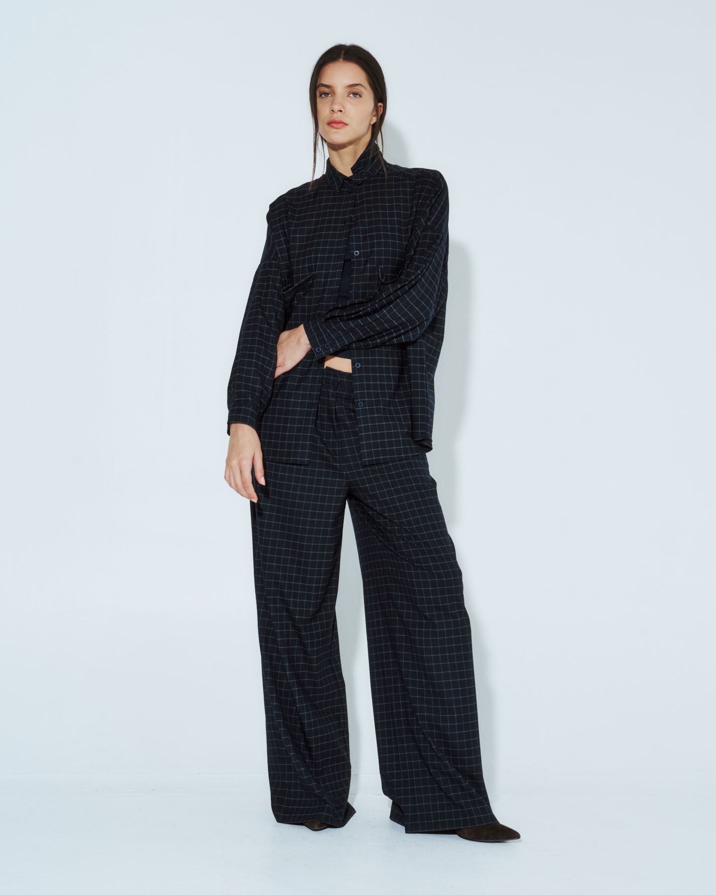 Pantalón Nébula con corte sastrero en lino, diseñado para una silueta impecable. Los cuadros azules aportan carácter a este básico versátil que funciona tanto en ambientes profesionales como en looks casuales. Confeccionado en lino de calidad, garantiza transpirabilidad y comodidad durante todo el día. Su corte recto y estructura clásica lo convierten en una inversión atemporal para tu guardarropa.