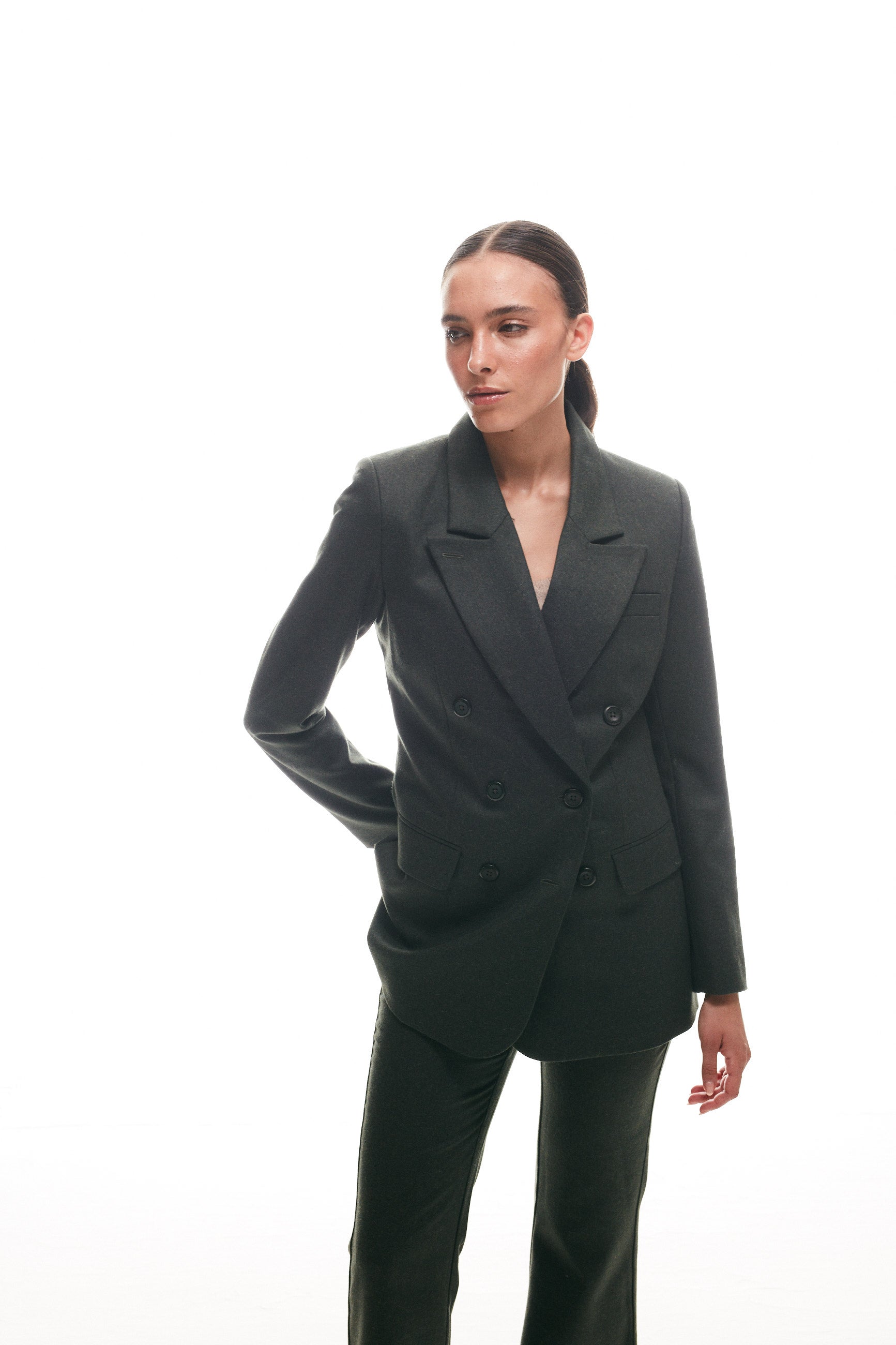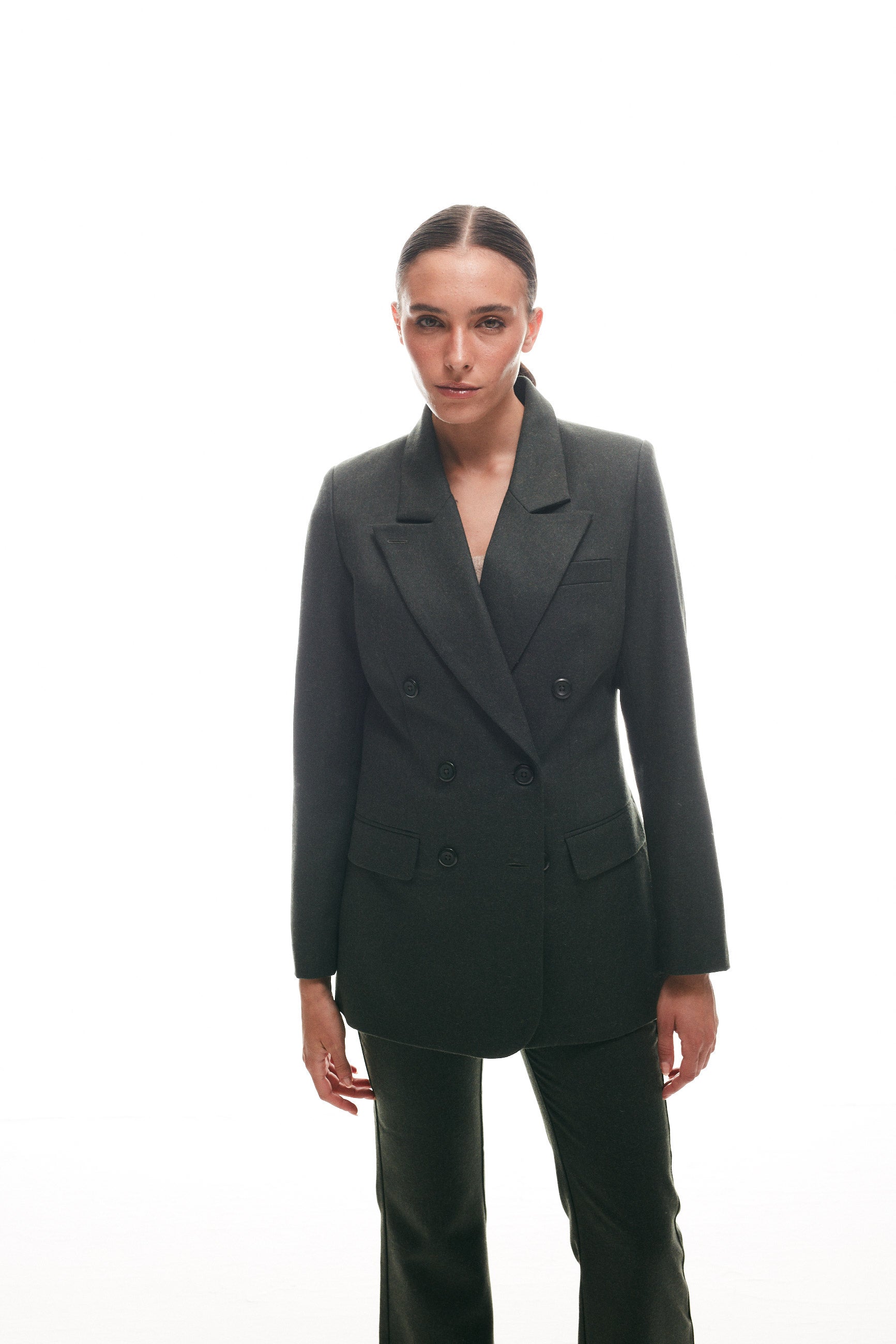 Este elegante blazer cruzado de paño de lana con cuatro botones delanteros te hará destacar en cualquier ocasión. Su diseño y calidad premium lo convierten en un imprescindible en tu guardarropa para un estilo sofisticado y exclusivo.