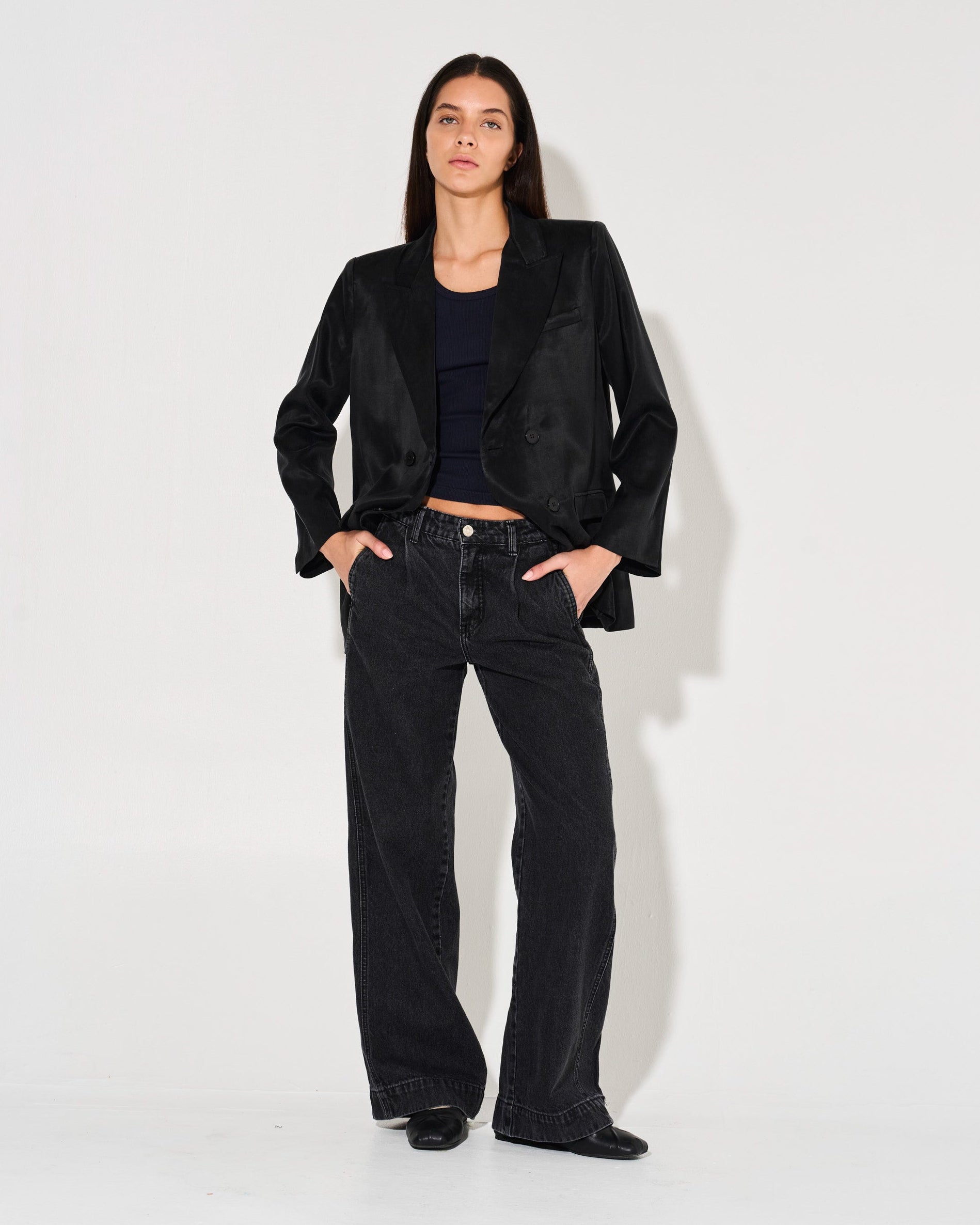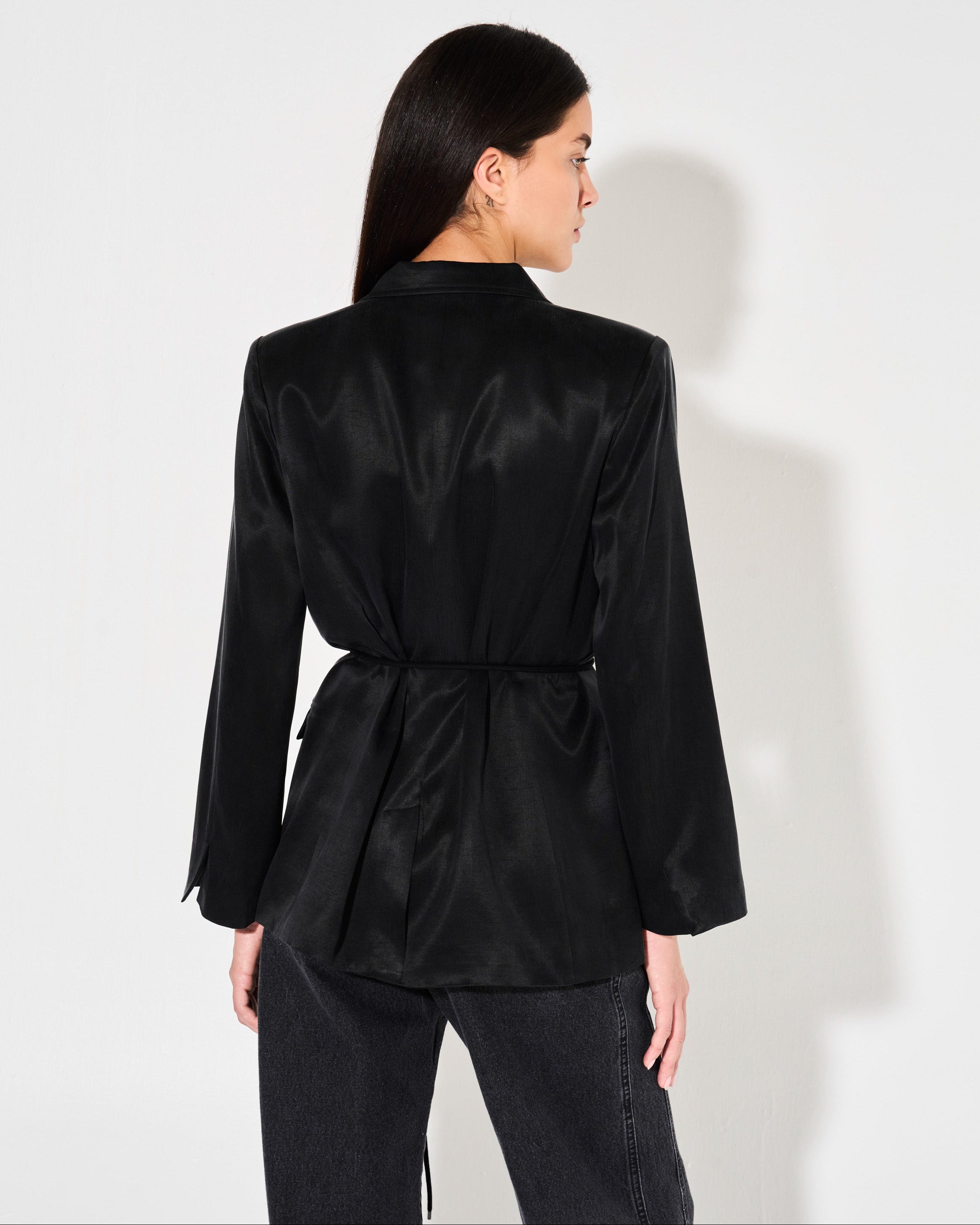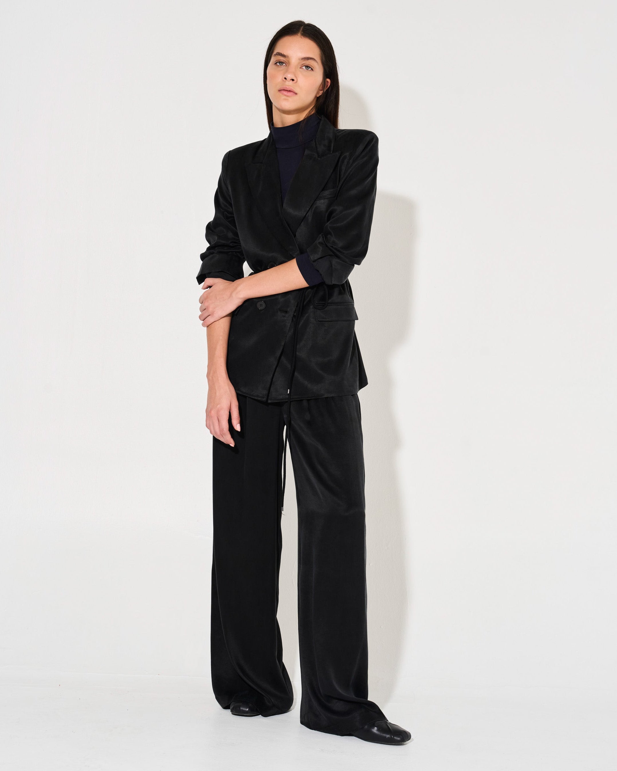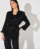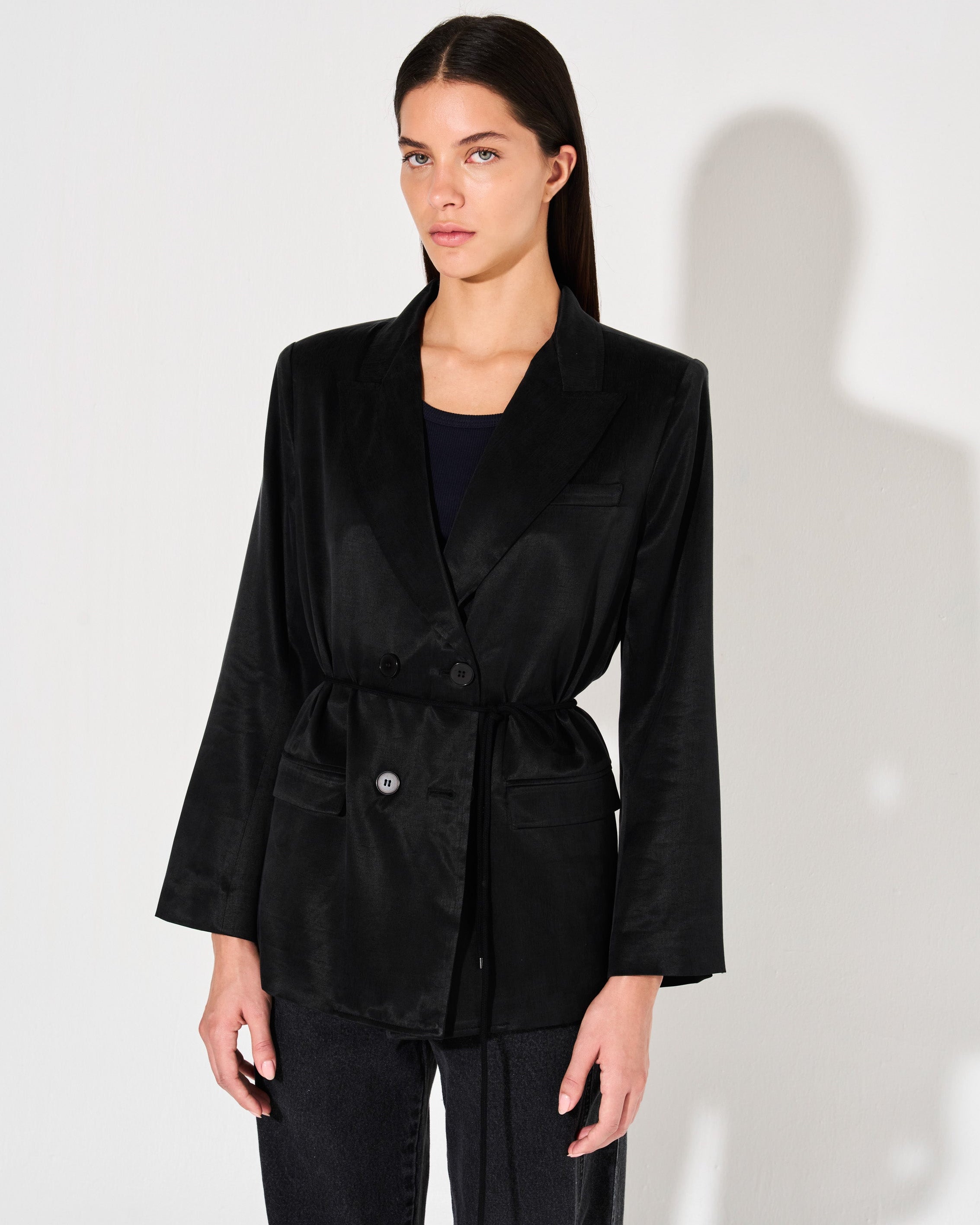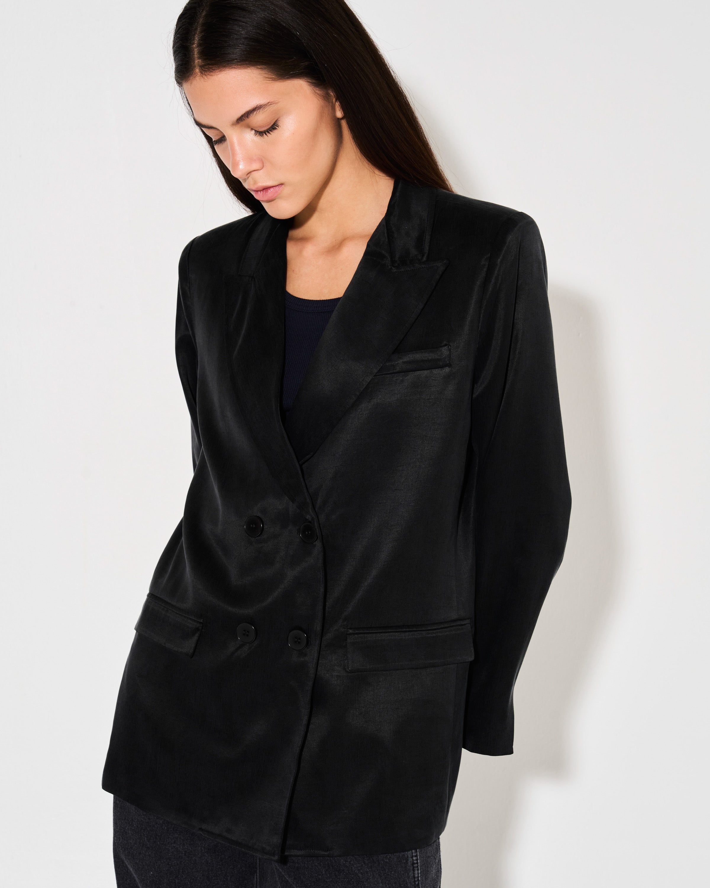 Este blazer cruzado es perfecto para un look sofisticado. Confeccionado en tela cupro para una caída fluida, su calce sastrero y cuello con solapa te brindan un estilo impecable. Los 4 botones en la parte frontal completan el diseño de manera elegante.